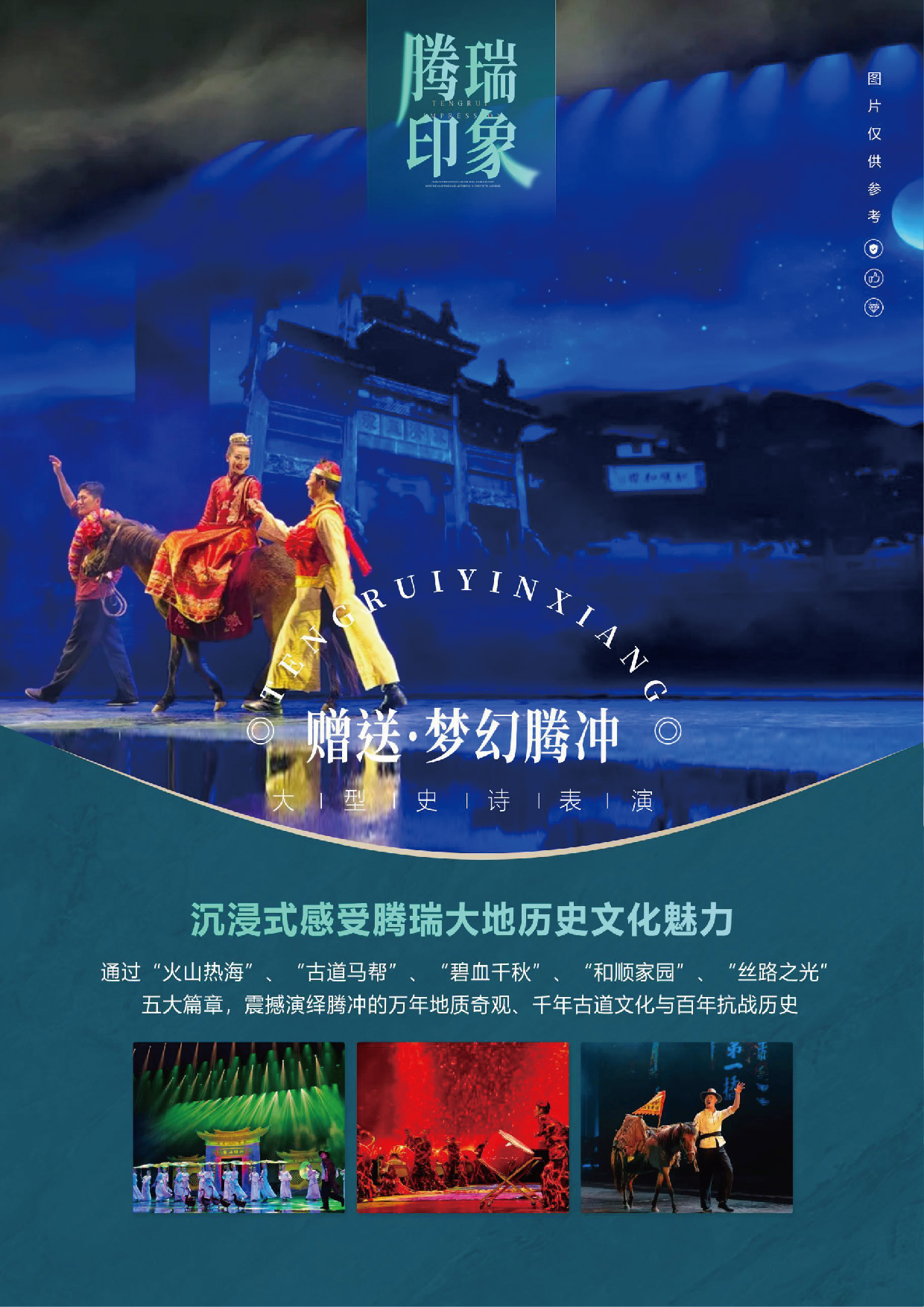 晚餐享用土锅子,后赠送观赏价值218元大型史诗极边绝唱《梦幻腾冲》(时间90分钟,赠送项目,客人不参加费用不退),演出饱吸了祖国边陲腾越大地的自然资源和人文资源,汇集了北京奥运闭幕式等全国一流的编创大师和灯光舞美大师,以国际水准的现代艺术手法,气势恢弘、地展示了腾冲的地域特色和历史文化魅力,,是中外游客来腾冲旅游的必到之处。整个表演由“火山热海”、“古道马帮”、“碧血千秋”、“和顺家园”和“丝路之光”五个篇章组成。返回酒店休息